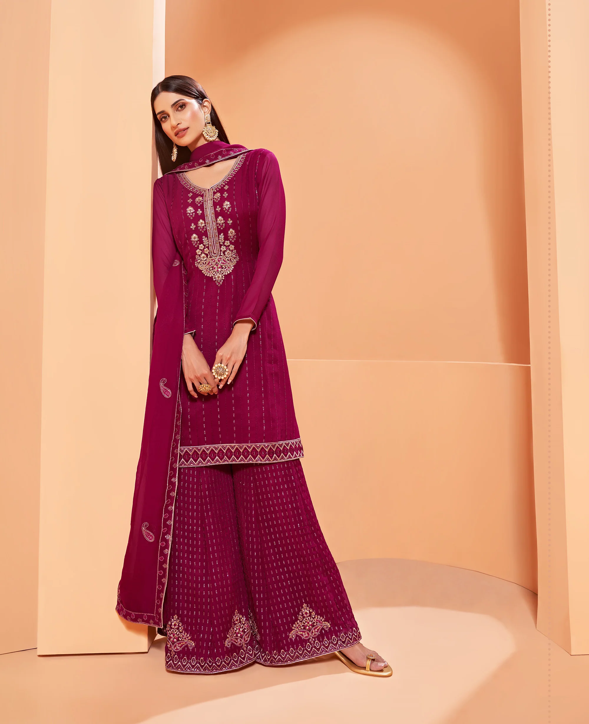 A bridesmaid would look gorgeous in this outfit. It is suitable for any occasion, such as wedding receptions, engagement parties, and sangeets. So don't wait any longer, add this Dark Pink Thread Embroidery Georgette Sharara for Sangeet to your wardrobe today!