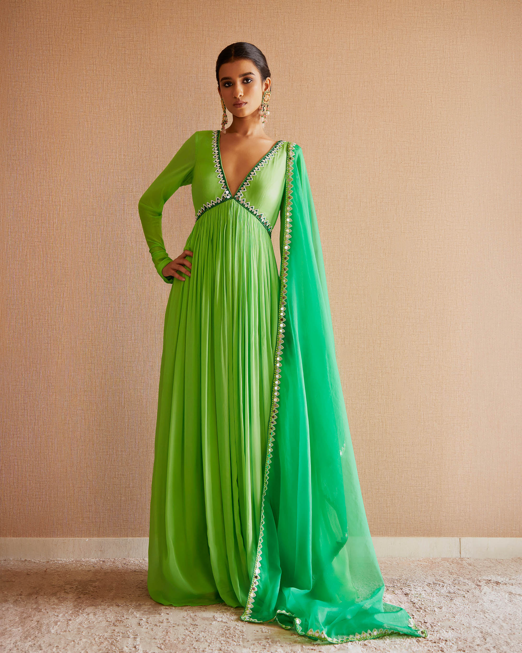 Light green mirror work and cutdana embroidered anarkali with leaf green embroidered organza dupatta.