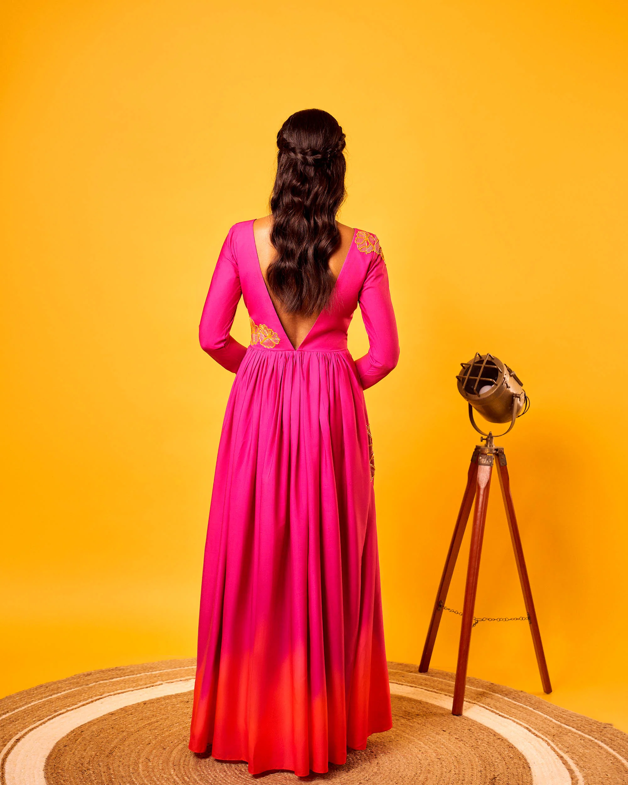 Pink-Orange Ombre Crepe Flower Anarkali Set
