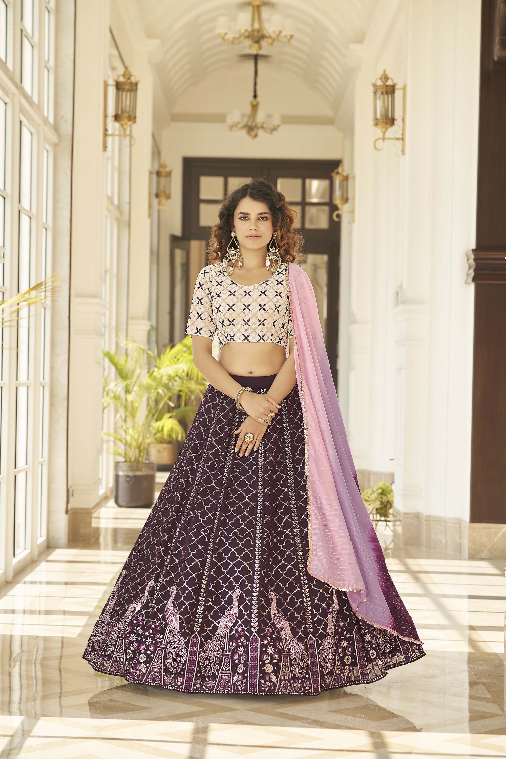 Are you seeking something exclusive? We've got what you require! This Purple Georgette Gota Embroidered Lehenga with its gorgeous Gota embroidery and bright purple color is the perfect option for those seeking to make an impact. You will certainly be the center of attention in this lehenga if you wear it to a wedding reception, an engagement party, or a sangeet. Pictured here is a bridesmaid wearing the Purple Georgette Gota Embroidered Lehenga, which you can purchase today!