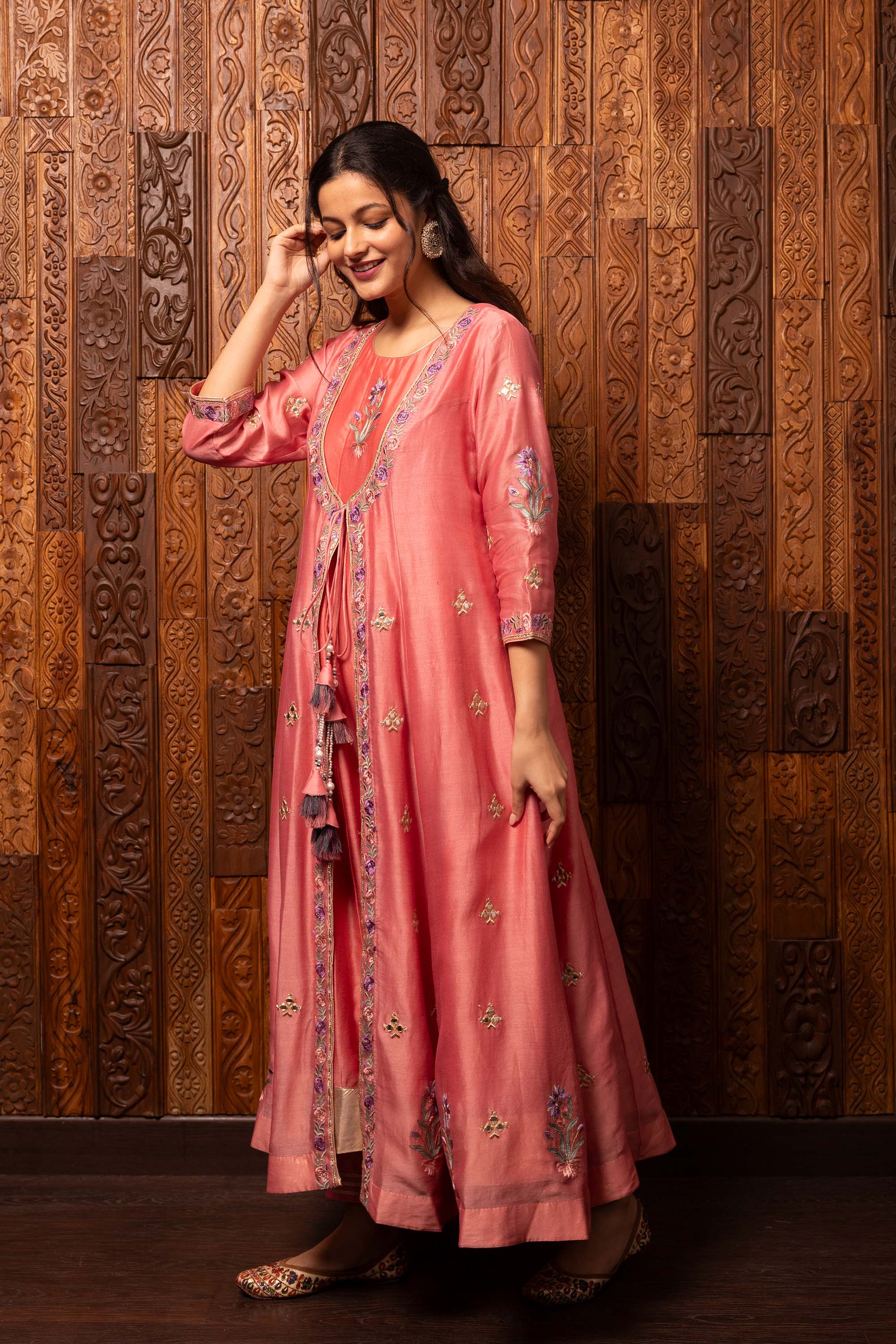 Featuring pink embroidered silk chanderi jacket style kalidar kurta with viscose dupion pant and pink embroidered organza dupatta.