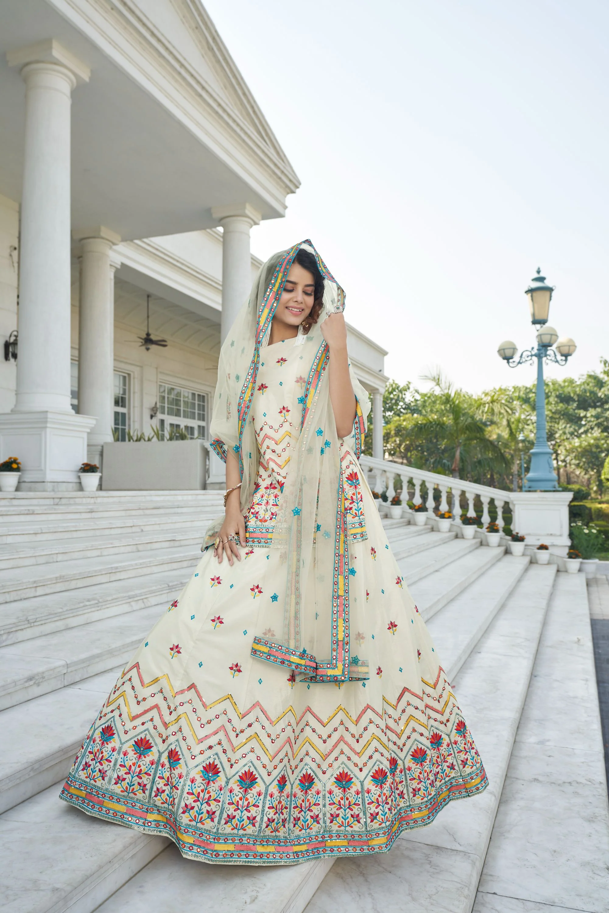 We unfurl our the intricacy and exclusivity of our creations highlighted in this style of a gorgeous off white Chinnon and faux chiffon a line lehenga choli. The ethnic embroidered, gota work, sequins and thread work at the attire adds a sign of elegance statement to your look. Comes with matching choli and dupatta.