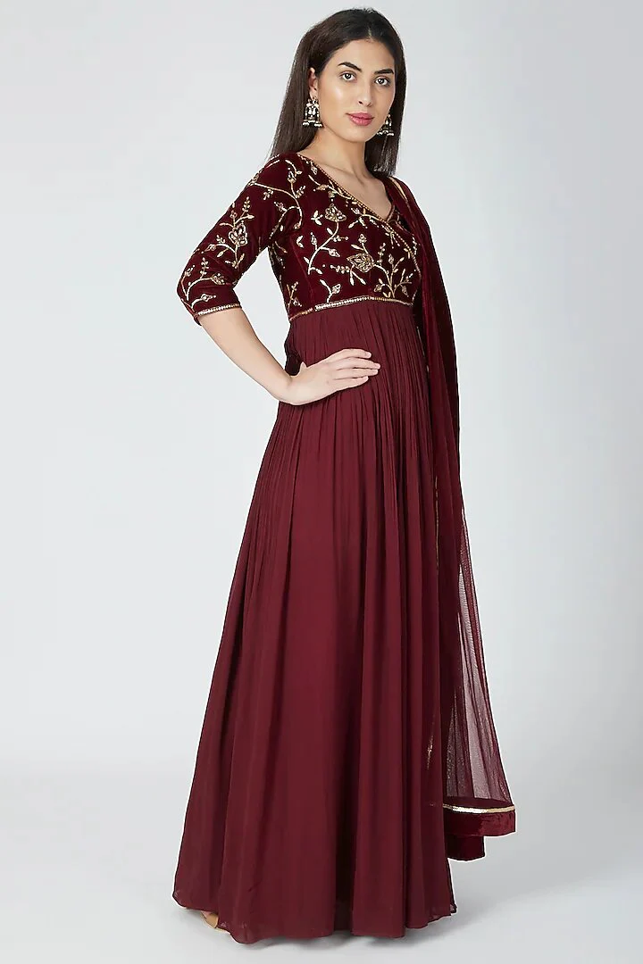 Wine Velvet Gota Embroidered Anarkali With Dupatta
